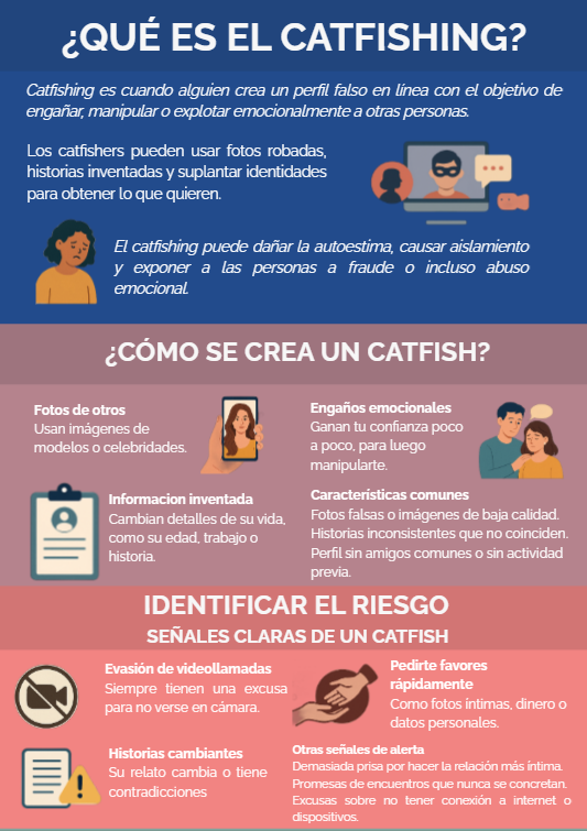 Descripción: El presente documento conceptual se organiza bajo el enfoque metodológico “Conocer – Identificar – Prevenir”, el cual permite a la comunidad educativa explorar este riesgo desde una perspectiva técnica, emocional y pedagógica. A partir de esta estructura, se propone una ruta de aprendizaje que contribuya a prevenir el catfishing en entornos escolares mediante la sensibilización, la detección temprana y la promoción de buenas prácticas digitales.